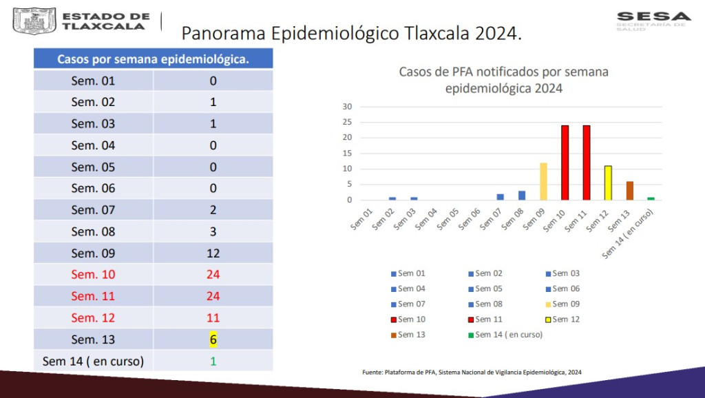 El reporte indica que, en la semana epidemiológicas 2, se identificó el primer caso de PFA en el estado, y el segundo en la número 3.