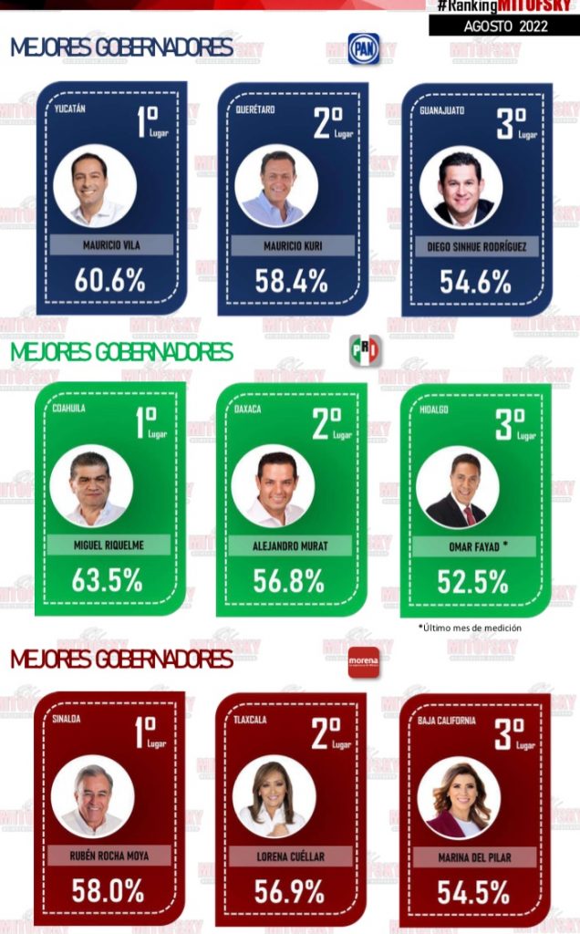 En tanto que los gobernadores con menor aprobación son David Monreal de Zacatecas 29.4 %, Miguel Barbosa de Puebla 37.3 %, Alfredo Ramírez Bedolla de Michoacán38.4 %, Enrique Alfaro de Jalisco 39.5 % e Indira Vizcaíno de Colima 40.6 %.