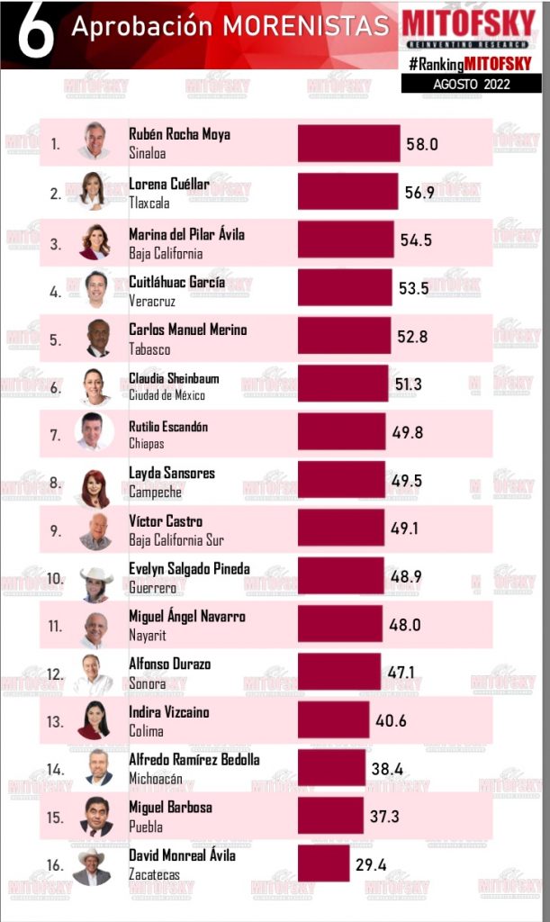 Además en el 6to apartado del Ranking  estadístico muestra que la aprobación de morenistas  colocó a la titular del ejecutivo en la segunda posición de aceptación, el primer lugar lo ocupa Ruben Rocha Moya, el tercer lugar lo ocupa María del Pilar Ávila,Cuitláhuac García el cuarto y el quinto lugar lo ocupa Carlos Manuel Merino.