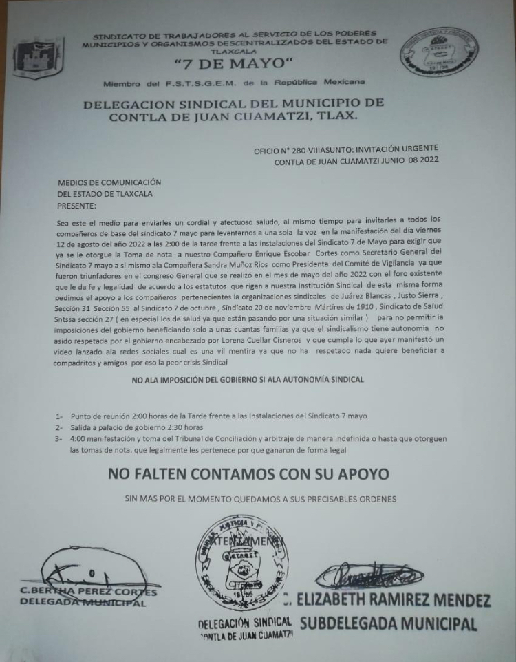 Mediante un anuncio en redes sociales las delegadas del sindicato 7 de Mayo del municipio de Contla de Juan Cuamatzi Bertha Pérez Cortés , Elizabeth Ramirez Mendez invitaron a diversas organizaciones sindicales a mega marcha por las principales calles de la ciudad el próximo viernes 12 de agosto como media de presión para el otorgamiento.