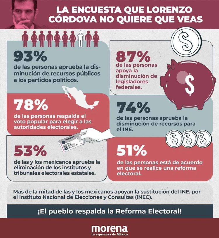 “La gente se ha expresado en este estudio y en su mayoría avala las modificaciones contenidas en la iniciativa de reforma electoral de nuestro presidente, es claro, que los mexicanos quieren que se reduzcan los recursos públicos a los partidos, así como disminuir el número de diputaciones y senadurías a nivel federal”, señaló.