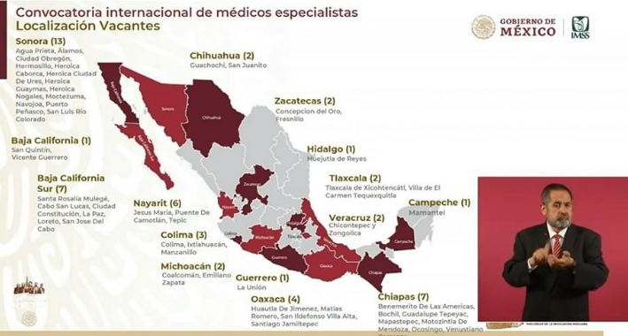 De acuerdo con la convocatoria internacional de médicos especialistas, las vacantes son: un especialista para Hidalgo, Campeche, Baja California y Guerrero; dos para Tlaxcala, Chihuahua, Zacatecas, Veracruz, Michoacán; tres para Colima; cuatro para Oaxaca; seis para Nayarit; siete para Baja California Sur y Chiapas, así como 13 para Sonora.