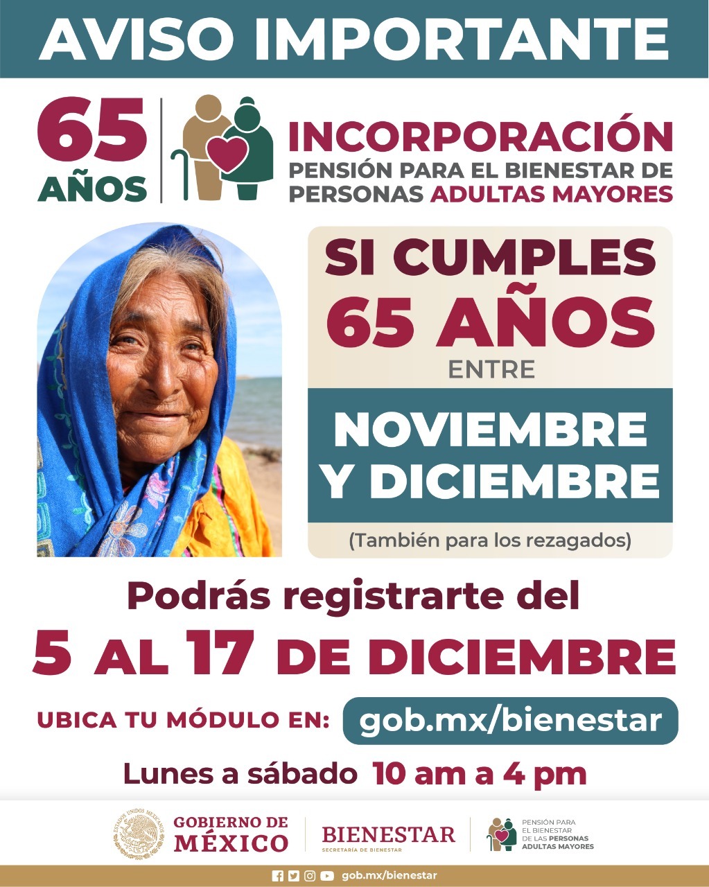 El Gobierno de México, a través de la Secretaría de Bienestar, informa que del 5 al 17 de diciembre se realizará registro para la incorporación a la Pensión para el Bienestar de las Personas Adultas Mayores, para quienes cumplen 65 años entre los meses de noviembre y diciembre.