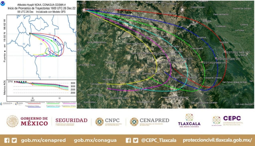 El Servicio Meteorológico Nacional (SMN), fuente oficial del Gobierno de México, emitió el siguiente aviso: “No hay visibilidad hacia la zona del volcán. En caso de alguna exhalación de vapor de agua, gas y/o ceniza se pronostica que tendría trayectorias hacia el este y sureste, cambiando al sur-sureste del cráter”.