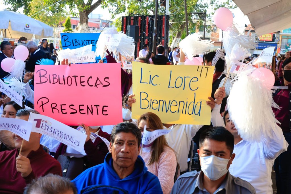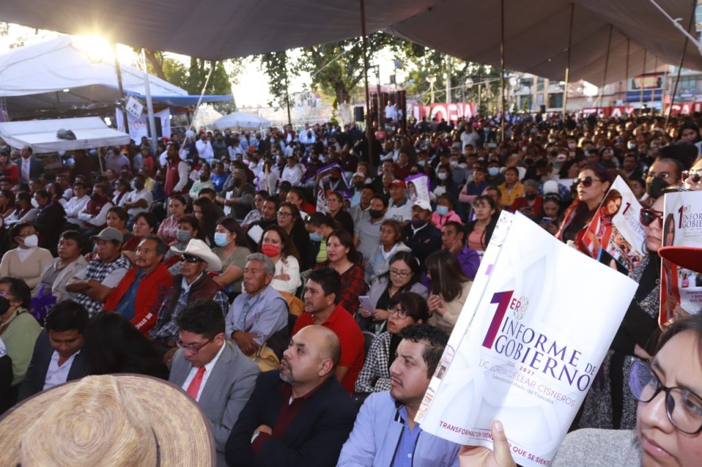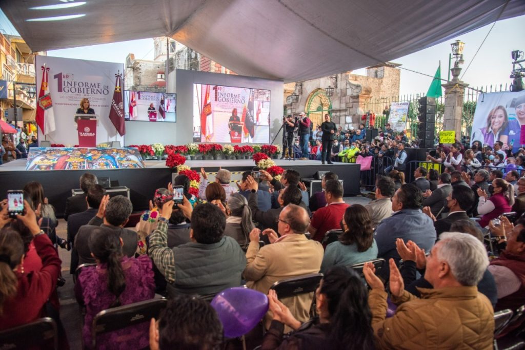 La gobernadora Lorena Cuéllar Cisneros presentó el informe de actividades correspondiente al primer año de su gestión a habitantes de la región de Zacatelco, a quienes reiteró su agradecimiento por darle su voto de confianza para iniciar una nueva historia de transformación y bienestar para Tlaxcala.