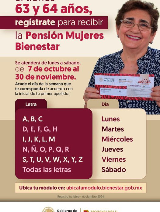 En el Salón de la Tesorería, informó que el registro se realizará del 7 de octubre al 30 de noviembre, de lunes a sábado de 10:00 a 16:00 h en los Módulos de Bienestar; para ubicar el más cercano a su domicilio es necesario ingresar a la página oficial de la Secretaría de Bienestar: gob.mx/bienestar.