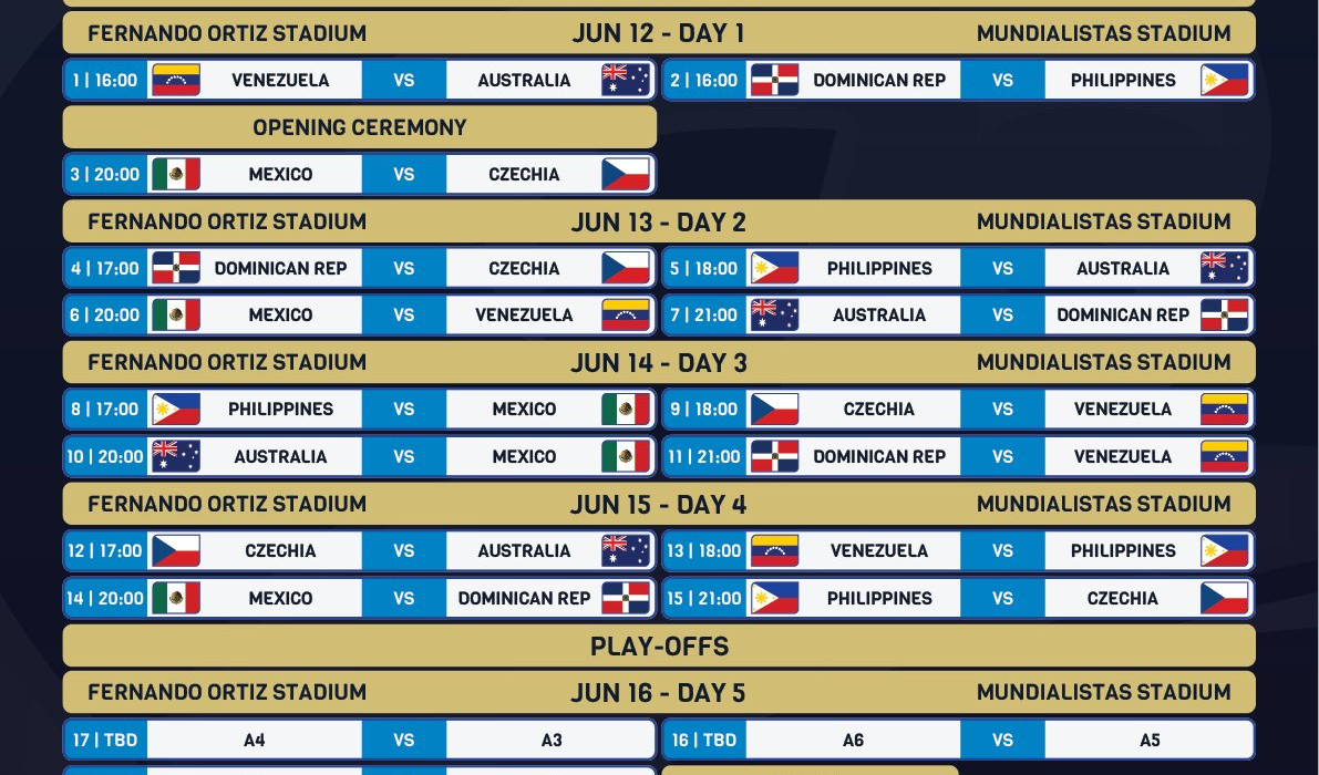 El día inaugural, el anfitrión; México; comenzará su camino contra la República Checa a las 20 horas locales en el Estadio Fernando Ortiz, justo después de la ceremonia protocolaria programada una hora antes. Previo a esto, Australia jugará contra Venezuela a las cuatro de la tarde, simultáneamente en el Estadio Mundialistas Hermosillenses, Filipinas y República Dominicana se enfrentarán.