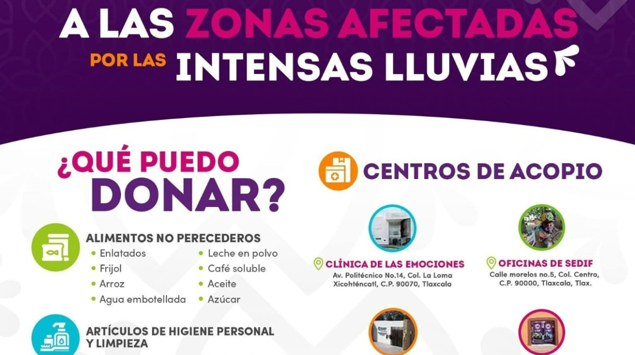 Las donaciones pueden entregarse de lunes a viernes, de 9:00 a 18:00 horas, en los siguientes puntos: Clínica de las Emociones (Av. Politécnico No. 14, Col. La Loma Xicohténcatl, Tlaxcala), Oficinas del Sedif (Calle Morelos No.5, Col. Centro, Tlaxcala), Cecapdif (Carretera Ocotlán–Chiautempan, frente al Cobat 01, Tlaxcala) y Casa de Día (Guerrero 13-30, San Pablo Apetatitlán).