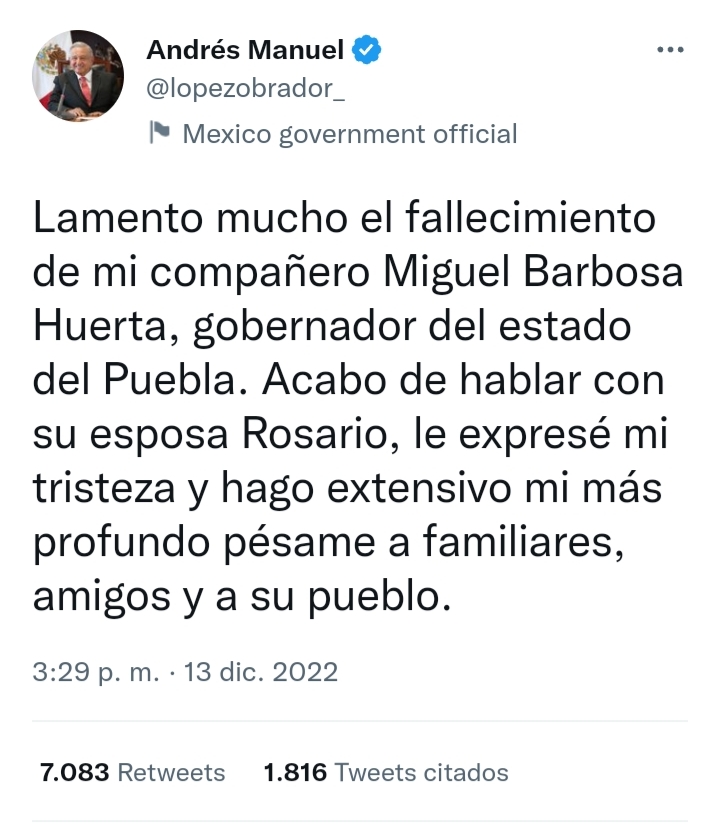 En su cuenta de twitter, el presidente Andrés Manuel López Obrador, confirmó su deceso y mandó su pésame a la familia: Lamento mucho el fallecimiento de mi compañero Miguel Barbosa Huerta, gobernador del estado del Puebla. Acabo de hablar con su esposa Rosario, le expresé mi tristeza y hago extensivo mi más profundo pésame a familiares, amigos y a su pueblo.
