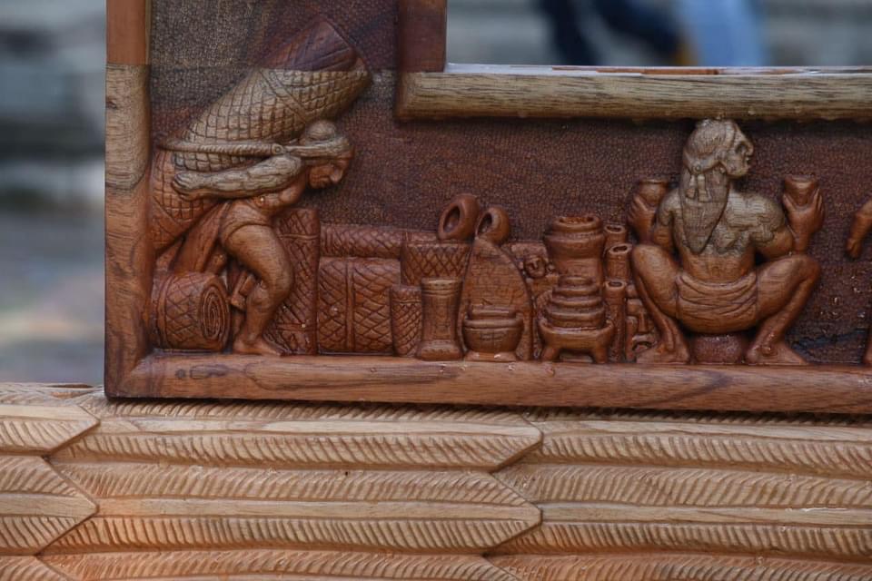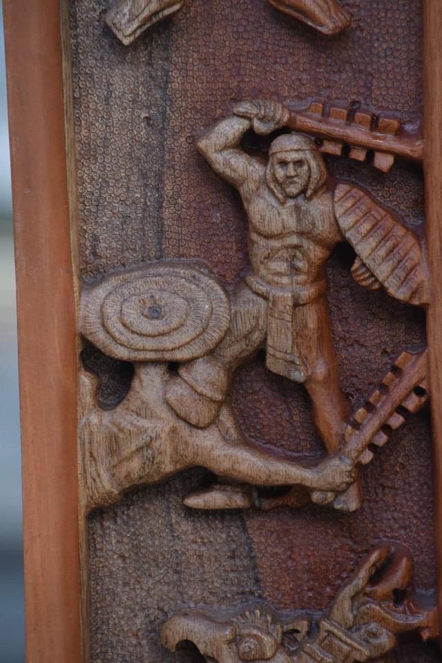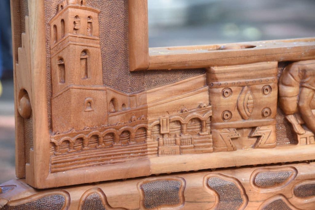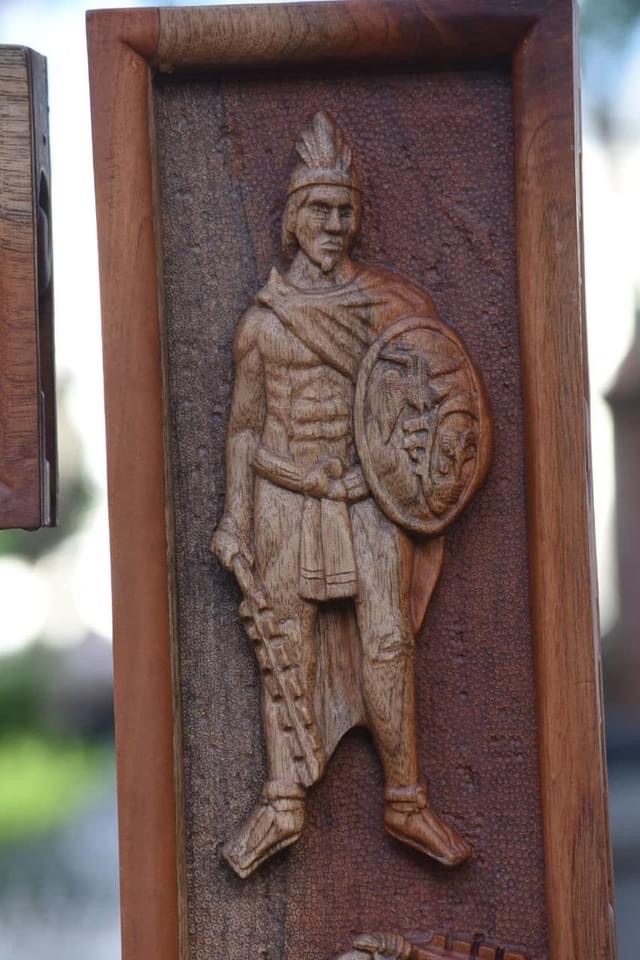 El artista detalló que esta pieza fue tallada en madera de cedro durante un año y posee elementos alegóricos a la cultura tlaxcalteca, su historia y tradiciones más arraigadas.