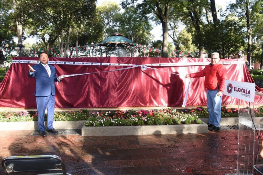 El presidente municipal de Tlaxcala, Jorge Corichi, y el artesano José Luis Vázquez develaron las nuevas letras monumentales de Tlaxcala, elaboradas bajo la técnica artesanal del tallado de madera de la localidad de San Esteban Tizatlán.